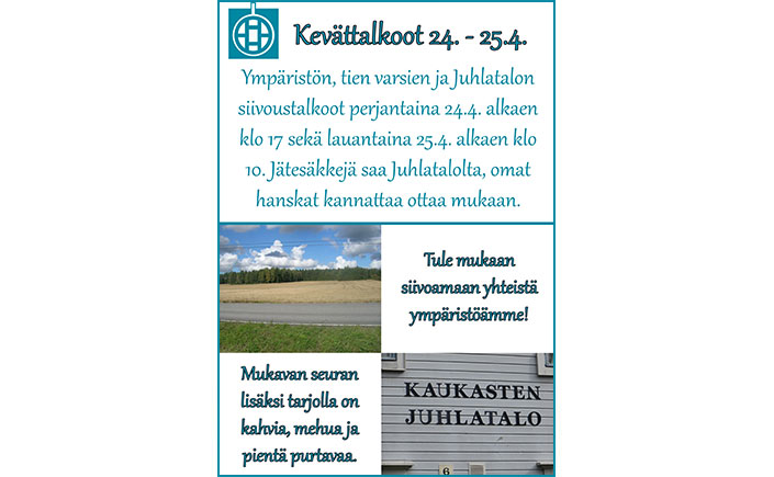 Ympäristön, tien varsien ja Juhlatalon siivoustalkoot perjantaina 24.4. alkaen klo 17 ja lauantaina 25.4. alkaen klo 10. Jätesäkkejä saa Juhlatalolta, omat hanskat kannattaa ottaa mukaan. Mukavan seuran lisäksi tarjolla on kahvia, mehua ja pientä purtavaa. Tule mukaan siivoamaan yhteistä ympäristöämme!
