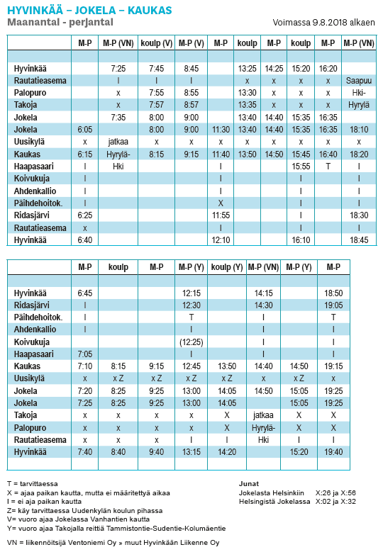 Hyvinkään Liikenteen bussi kulkee Hyvinkään, Kaukasin ja Uudenkylän välillä maanantaista perjantaihin. Hyvinkäällä on helppo jatkaa matkaa Hyvinkään paikallisbusseilla