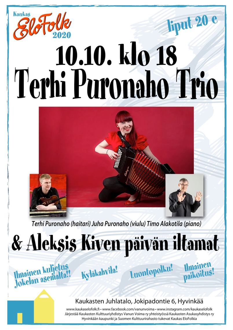 LIPUT http://www.ticketmaster.fi/event/aleksis-kiven-paivan-iltamat-ja-terhi-puronaho-trio-lippuja/286055