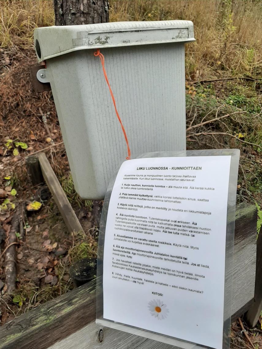 - Alueellemme on varattu useita roskiksia. Käytä niitä. Myös Juhlatalolle voi kuljettaa eväskääreet. Suuremmat roskamäärät kuuluvat kunkin talouden omiin roskiin tai kaatopaikalle. Meidän kylämme alue, kuten tienvarret tai monttujen kulkutiet eivät ole tarkoitettu niille.
