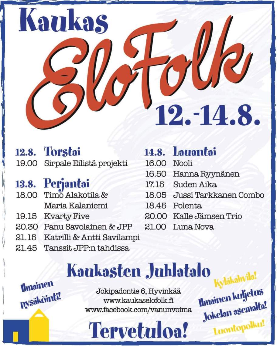 Elofolk jälleen elokuussa. 28.7.2021tiinalesonen Jätä kommentti Jaa: Jaa Facebookissa(Avautuu uudessa ikkunassa) Facebook Click to share on X(Avautuu uudessa ikkunassa) X Jaa LinkedIn:ssä(Avautuu uudessa ikkunassa) LinkedIn