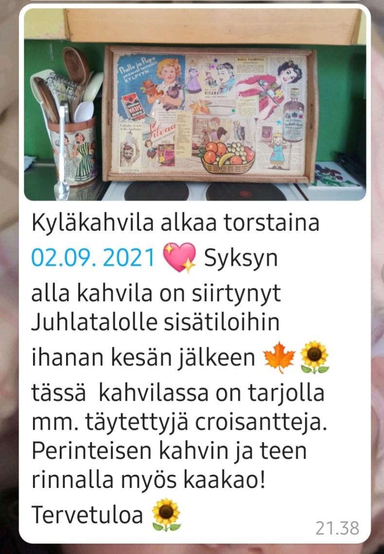Ihanaa syksyn alkua. Kyläkahvila torstaisin syyskaudella Juhlatalolla klo 15-17. Tervetuloa mukavaan seuraan ja maistelemaan, mitä Ihanaa Ullanen tarjoileekaan. Ja kahvia saa aina. Viimeinen kyläkahvila tällä kaudella ennen joulua on 25.11.
