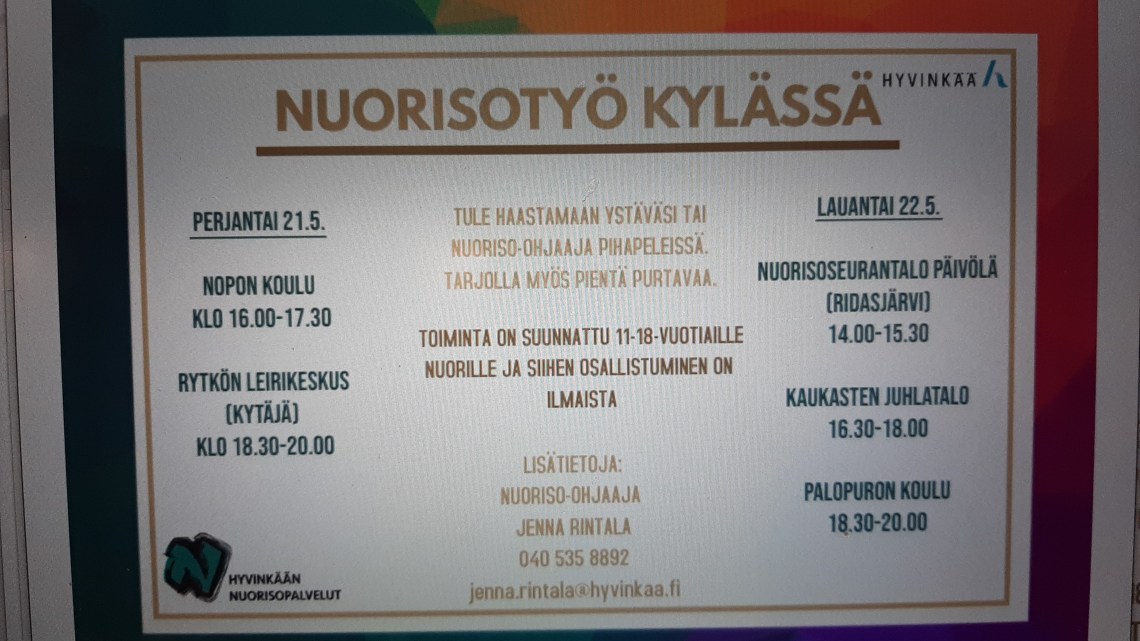 Nuorille toimintaa Kaukasten juhlatalolla. Hyvinkään kaupunki, nuorisotoimi, järjestää. Lauantaina 22.5. klo 16.30-18. ☀️👍🏼