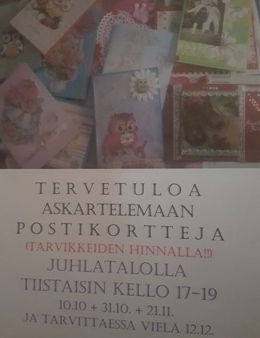 Tervetuloa askartelemaan postikortteja pelkkien tarvikkeiden hinnalla! Tapaaminen Juhlatalolla 10.10., 31.10., 21.11. ja 12.12. klo 17-19.