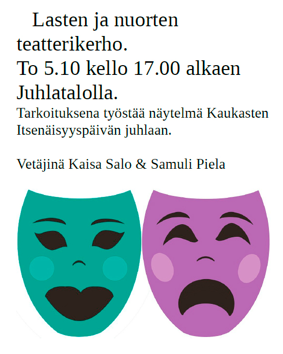 Kaikenikäiset lapset ja nuoret tervetuloa mukaan maksuttomaan näytelmäkerhoon! Tapaamme Juhlatalolla 5.10. alkaen torstaisin klo 17. Kerho tekee 24.10. retken Willan nuorisoteatterin Kalevala-näytelmään (asukasyhdistys maksaa lipun).